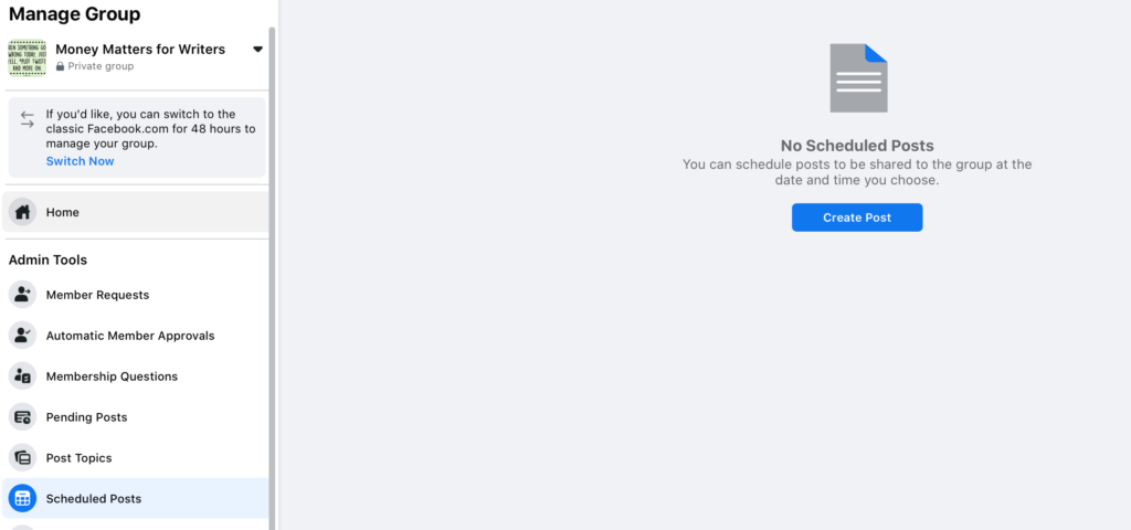 You can also schedule posts (and review content that’s on the calendar) through the group’s navigation tab on the left side under “Scheduled Posts.” You can create new content here and determine when it will be published.