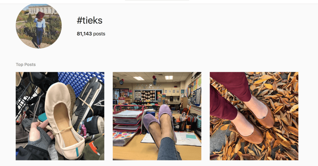 Tieks, my favorite shoes, has an enormous amount of UGC on Instagram; when you search their branded hashtag, user-generated content will almost always be the first thing to appear. It’s what convinced me to buy my first pair, so it is an effective strategy.
