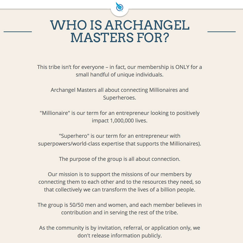 Take a look at this copy from Archangel Masters. This copy is almost the first text you see on the page (after a brief one-line description of what it is). They go immediately for exclusivity with a hint of “caring,” stating that the group is only for very high-caliber people who want to make a big impact on the world.