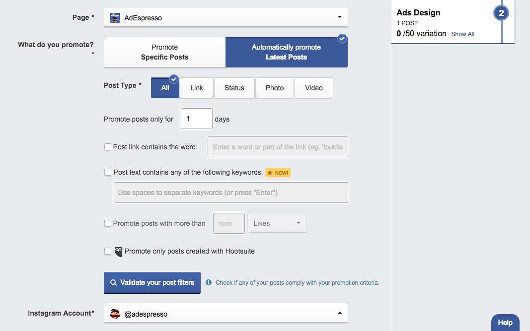 AdEspresso’s Automatic Post Promotion tool gives you full control over what’s promoted and for how long. When setting up your campaign you can filter posts that will be promoted based on post type, keywords in the link or text, and engagement and whether the post has been published via Hootsuite.