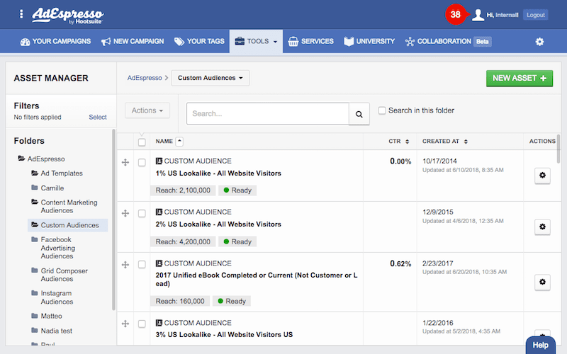 Custom and Lookalike Audiences are great for retargeting campaigns and finding people interested in your business. With AdEspresso’s Asset Manager, you’ll be able to find the Custom and Lookalike audiences that you created on Facebook right in your Ad Account’s folder!