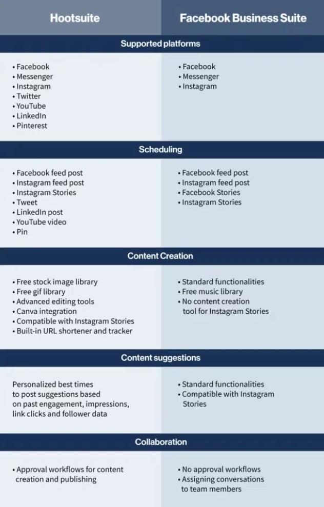 A social media management tool like Hootsuite will enable you to schedule content to major social networks like Facebook, Twitter, Instagram, TikTok, LinkedIn, Pinterest, and YouTube from one place. Here’s a comparison between Hootsuite and Business Suite: