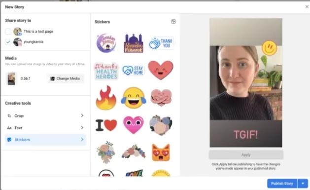 When you click on any of these options, a Story creator window will popup. In the window, select the account you want to publish your Story on, and upload a photo or video to start making your Story.