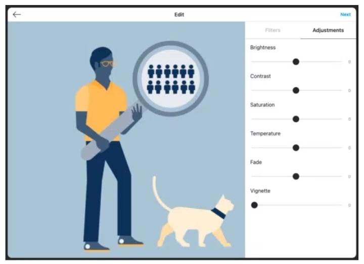 - If you want to, you can click the Filters tab to apply one of the 12 preset filters. Or click the Adjustments tabs to manually adjust things like brightness, fade, and contrast. Click Next.