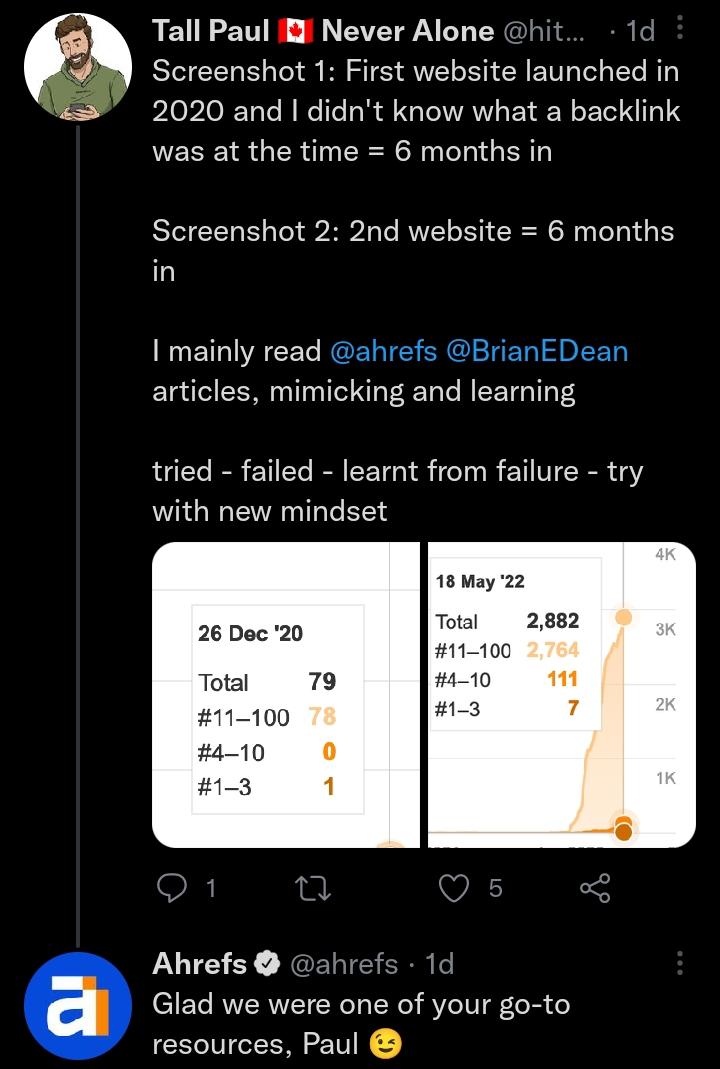 For example, Ahrefs replied to Tall Paul’s tweet where he talked about the influence of Ahrefs’ blog on his career.