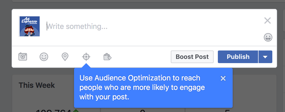 For example, if we were to share a Facebook Advertising Guide on AdEspresso’s Facebook page, we could optimize this post’s audience by targeting “Facebook advertising” and “Advertising” interests.