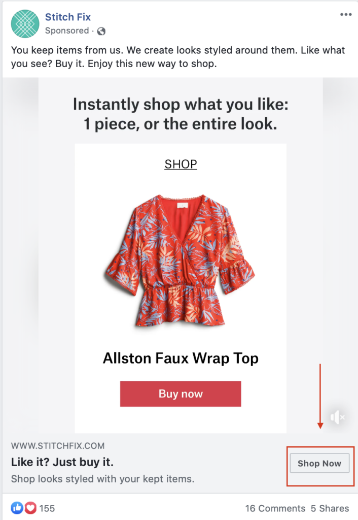 You have probably seen call to action examples like this in the advertising strategy of ecommerce brands. The main goal is to sell. At the same time, the ad focuses on the experience instead of rushing to take the user to a web page. In this case, “Shop Now” is the type of CTA that is direct, yet, the ad copy does most of the selling.