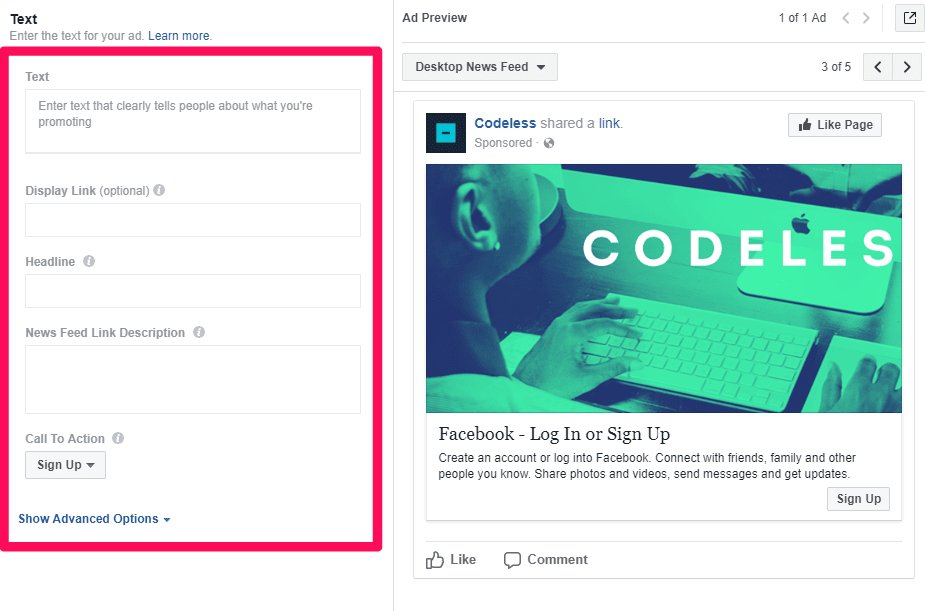 Create your ad text, add images, and decide what your CTA will be (if your aim is to gain email subscribers, “Subscribe” or “Sign up” are definite winners).