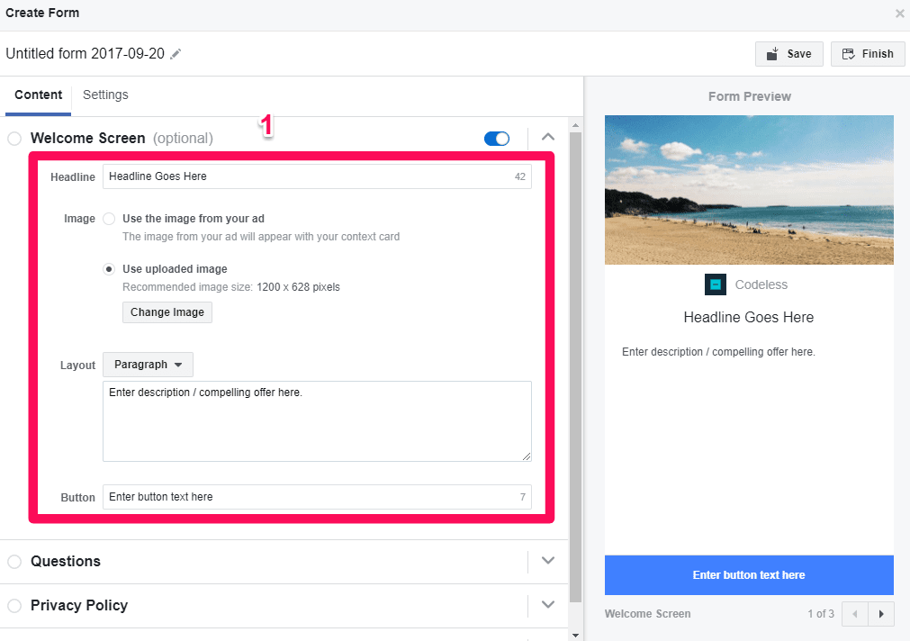 Those who click on your CTA will be asked to fill in your form, which Facebook will now ask you to create. Here, it’s the same story: edit text, images, layout, and form fields here.