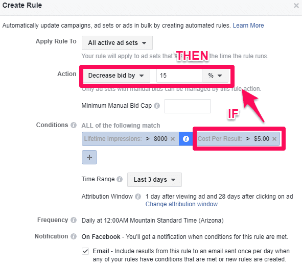 The last step, and perhaps the step that makes this bonus step such a money-saver, is to create a rule for your ad to automatically decrease your budget when your CPL is too high.