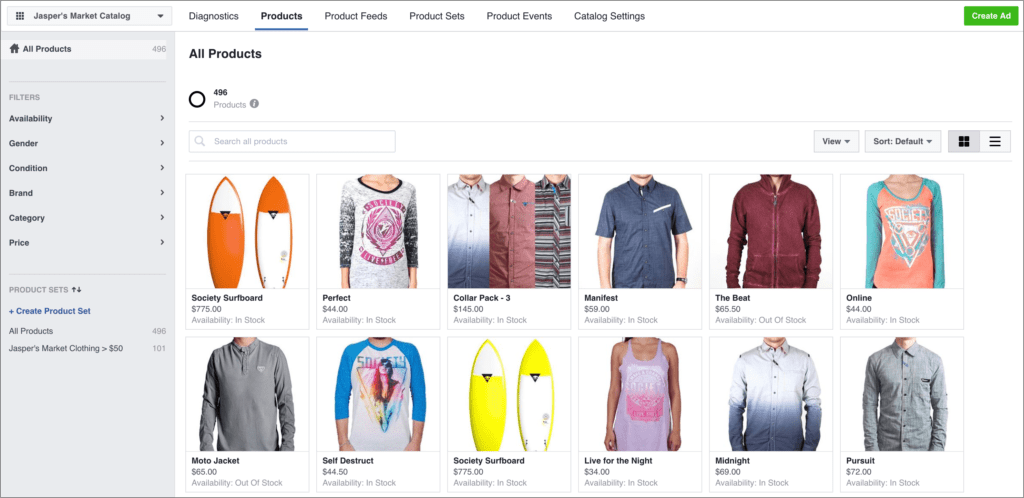 Next, in your Catalog Manager, navigate to the Products tab, where you’ll be able to create product sets, add filters, and gain insights on how your inventory has performed over time.
