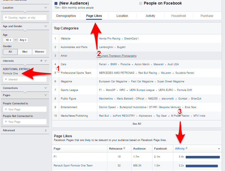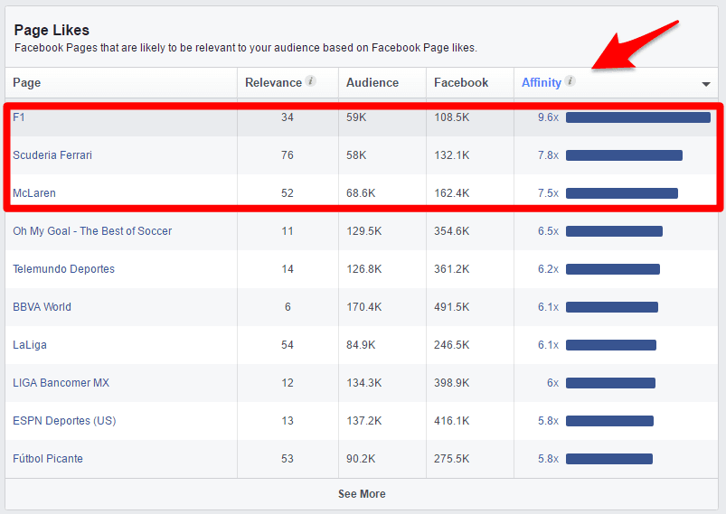 In the screenshot below, it means that the audience who likes F1 racing is 3.4x more likely to be interested in my interest “Formula One” compared to everyone on Facebook.