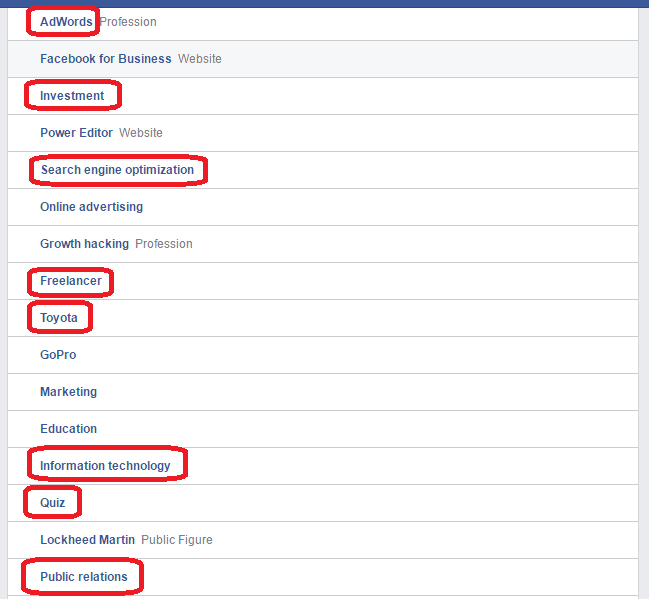 Below is an example of my own supposed ad preferences. Those circled in red are those that I’m NOT interested in, but Facebook still thinks I am.