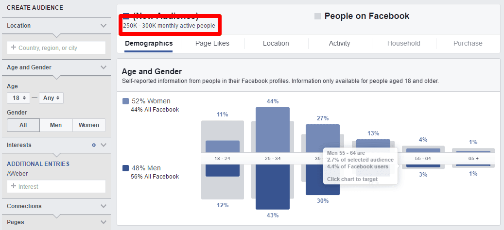 As you can see in the example above the Facebook fan page has 56.884 people liking the page but Audience Insights tells us there are 250K-300K monthly active people when I enter AWeber (which by the way was the only “Aweber” I could find available for targeting).