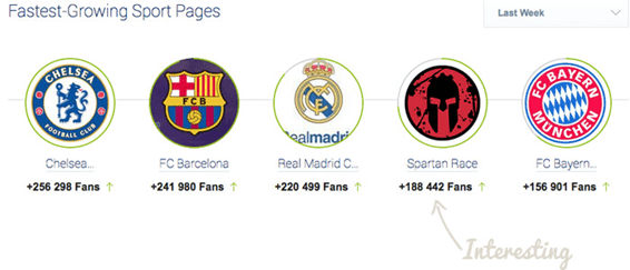 This is another great example from Glen. In this case, he fired up Social Bakers, looked at the fastest growing sports brands in a certain week and noticed “Spartan Race” that stood out among other more obvious choices.