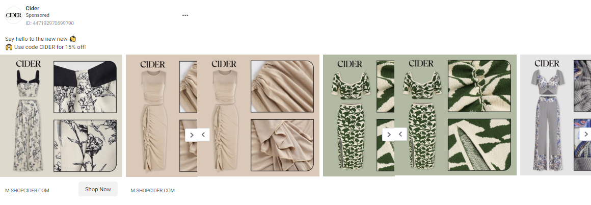 • Give discounts. In this ad, Cider gives potential shoppers 15% off if they use their special code. This discount is an incentive that prompts people to buy.