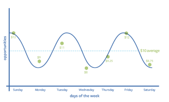 Some days, when Facebook spots high-potential opportunities, it may spend up to 25% more than your daily budget (and then lower the spend on the low-potential days). As you select the daily budget, your daily ad spend could look like a set of curves.