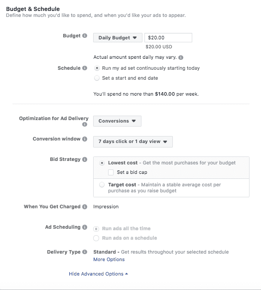 1. Daily budget – Facebook will spend this sum on delivering your ads every day during your campaign. When you set your daily budget, you’re telling Facebook to get you roughly your daily budget’s worth of the results every day.